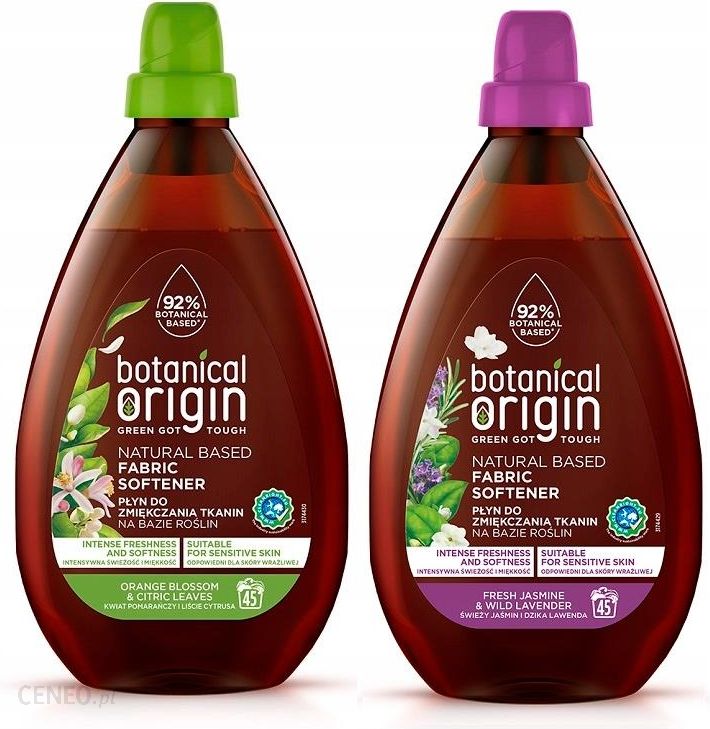 Botanical Origin Płyn do zmiękczania tkanin1x Kwiat Pomarańczy i Liście Cytrusa 900 ml1x Świeży Jaśmin i Dzika Lawenda 900 mlNadaje intensywną świeżość i miękkośćNa bazie roślin92% składników aktywnych pochodzenia roślinnegoPosiada certyfikat cleanright.euOdpowiedni dla skóry wrażliwejTestowany dermatologicznieHipoalergiczny0% Barwników celowo dodanychPiękny zapach pomarańczy i cytrusów oraz jaśminu i dzikiej lawendyPłyn do zmiękczania tkanin Botanical Origin to produkt, który używając siły natury zapewni przyjemną miękkość Twoich ubrań i pozostawi długotrwały, świeży zapach. Formuła to zupełna nowość na rynku, tworzona na bazie roślin, ze składnikami pochodzenia roślinnego oraz. Aż 92% naszych aktywnych składników jest pochodzenia roślinnego.Płyn Botanical Origin odpowiedni jest dla wrażliwej skóry, hipoalergiczny, więc możesz go używać do prania odzieży całej rodziny, nawet ubranek Twojego dziecka.Możesz mu zaufać, został przetestowany dermatologicznie i ma 0% barwników celowo dodanych.Opakowanie po zyżuciu koniecznie poddaj segregacji! Nasze butelki wykonane zostały w 25% z materiałów pochodzących z recyklingu. Autentyczność potwierdzona certyfikatem cleanright.euMisją Botanical Origin jest pomagać Ci zmniejszyć wpływ na środowisko, dając Ci bardziej zrównoważony wybór bez konieczności rezygnacji ze skuteczności. Dlatego stworzyliśmy gamę środków czyszczących na bazie roślin uwalniających moc natury.Wypróbuj całą gamę produktów, a zobaczysz, że pokochasz Botanical Origin od pierwszego użycia!Zalecane dozowanie na opakowaniu.Składniki (więcej informacji o składach na www.rbeuroinfo.com):5 % – 15 %: kationowe środki powierzchniowo czynne< 5 %: kwas L(+)-mlekowy, kompozycja zapachowaNASZA SKUTECZNA FORMUŁA NA BAZIE ROŚLIN:Środek kondycjonujący: Kationowy środek powierzchniowo czynny na bazie roślin**Długotrwały zapach: Zapach wzbogacony olejkami eterycznymiAby zachować jakość formuły: Kwas mlekowy na bazie roślin**Substancja rozpuszczająca: wodaBotanical Origin Płyn do zmiękczania tkanin. Trzymać z dala od dzieci. Przechowywać produkt z dala od żywności i napojów. Nie połykać. W przypadku połknięcia zasięgnąć porady lekarskiej.Unikaj bezpośredniego kontaktu z tkaniną. Nie mieszaj z innymi produktami.Wstrząśnij przed użyciem.