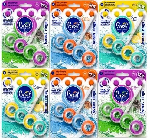 Brait Kostka Toaletowa Rings 2xForest, 2xLemon, 2xOcean Świeżość i siła zamknięte w oryginalnym pierścieniowym koszyku. Nowa zawieszka Brait Rings łączy w sobie tradycyjny zapach morski, leśny i cytrynowy z niespotykaną intensywnością, wyjątkową pienistością oraz niestandardowymi fluorescencyjnymi kolorami. Brait Rings to widoczny połysk i wsparcie w zapobieganiu osadzania się kamienia w toalecie. Brait Rings IN-OUT Water Circulation wykorzystuje wewnętrzny i zewnętrzny strumień wody, który obmywając kostkę gwarantuje bardzo intensywną pianę i widoczne efekty Twojej pracy, dzięki którym pozostawisz swoją toaletę czystą i świeżą na dłużej. Brait Forest Rings to kostka toaletowa o oryginalnym kształcie, która zamknięta w kilkuwarstwowym pierścieniowym koszyku nie tylko doskonale odświeża i zapewnia widoczne efekty działania, ale również nadaje muszli nowoczesnego charakteru. Połączenie pastelowego fioletu z fluorescencyjną zielenią wzmocni intensywny leśny zapach, który dzięki naturalnym olejkom w składzie będzie uwalniać się do ostatniego spłukania. Brait Forest Rings zapewnia widoczny połysk, wsparcie w zapewnieniu higienicznej czystości i ochrona przed osadzaniem się kamienia w toalecie. Intensywna piana i leśny odświeżający zapach w Twojej łazience. Pojemność: 3x2x40g (2xForest, 2xLemon, 2xOcean)