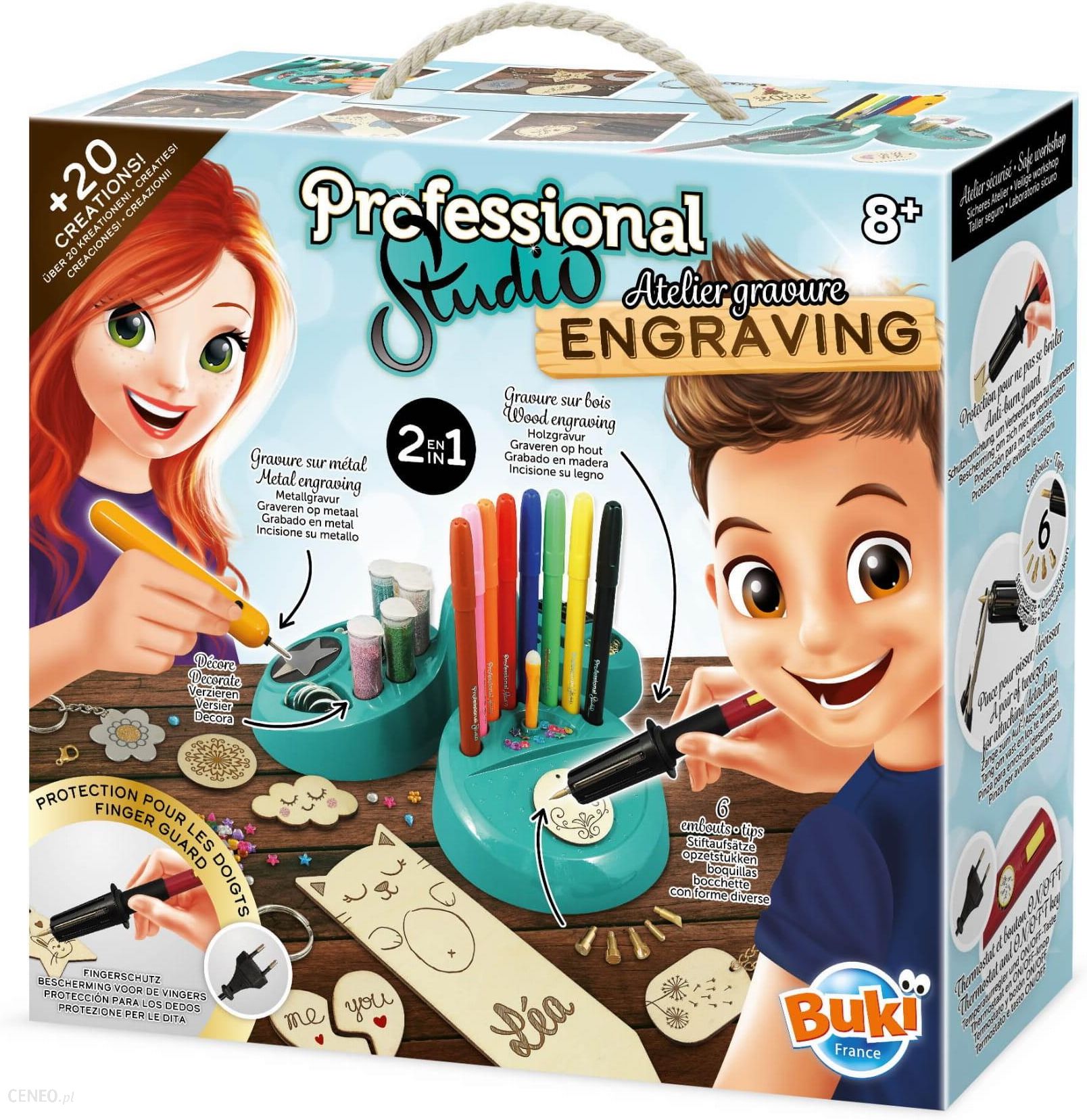 Narzędzie do wypalania w drewnie jest wyposażone w osłonę zapobiegającą oparzeniom oraz regulację temperatury.Zestaw uczy cierpliwości, wymaga skupienia uwagi na jednej czynności przez dłuższy czas.Buki Professional Studio GrawerowanieZestaw zawiera:- 1 stację roboczą-przybornik, narzędzie do wypalania w drewnie z osłoną- narzędzie do grawerowania w metalu, szczypce do wymiany końcówek- 6 końcówek do wypalania w drewnie, 5 fiolek z brokatem- drewniane i metalowe elementy do ozdobienia, magnesy do ozdobienia- łańcuszki, kółeczka, karabińczyki (kolor: złoty i srebrny), flamastry, klej i cyrkonie- instrukcję krok po kroku (brak języka polskiego)Wymagany nadzór osoby dorosłej.WYMIARY OPAKOWANIA: 28 x 9,5 x 26 cmWIEK: od 8 lat