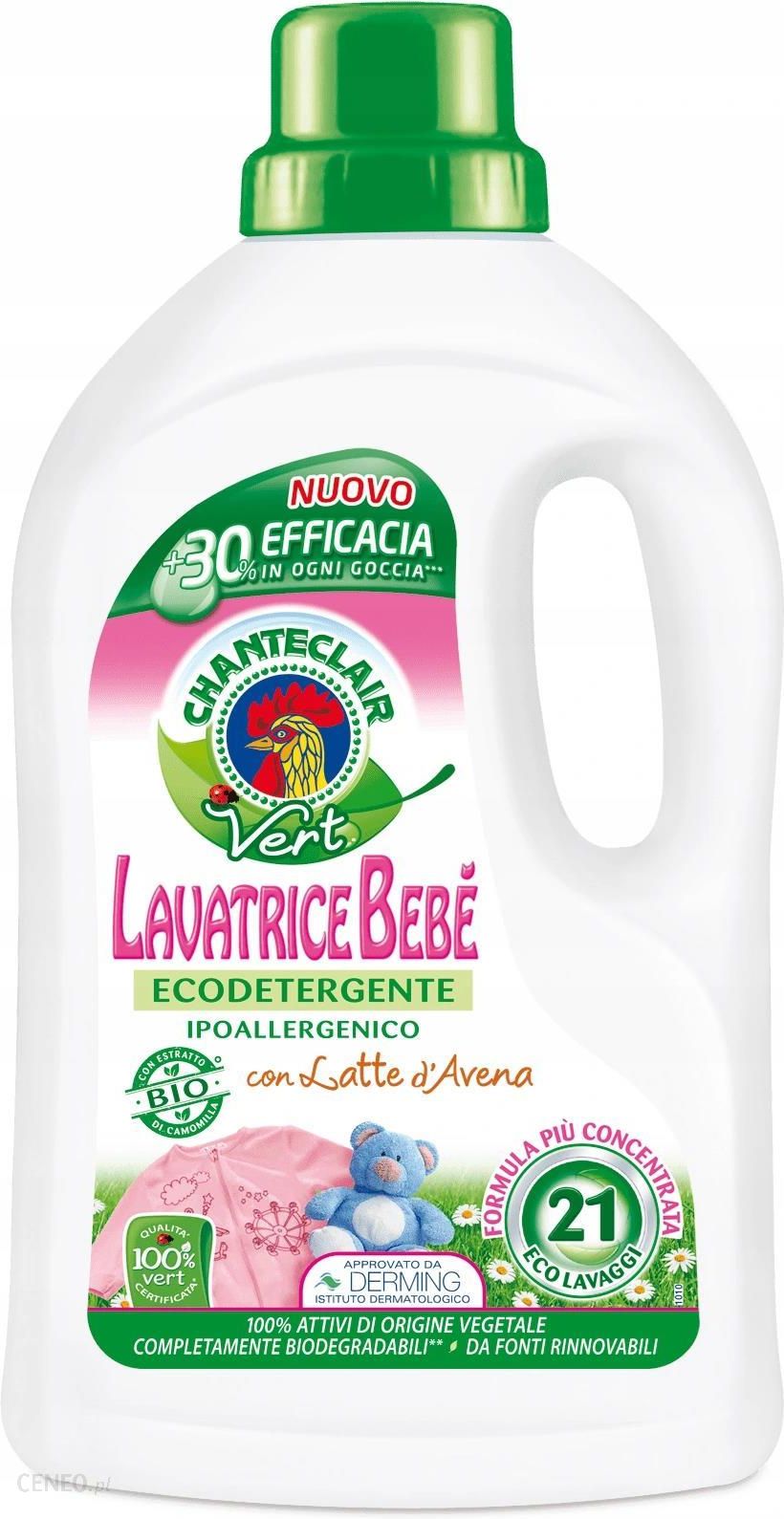 Chante Clair Vert Bebe Mleko owsiane – hipoalergiczny płyn do prania ubrań dziecięcych (1071 ml – 21 p) Formuła oparta jest na zastosowaniu w 100% substancjach czynnych pochodzenia roślinnego. Detergent wzbogacony o mleko owsiane znane z silnych właściwości kojących oraz nawilżających. Płyn do prania tkanin głęboko wnika w strukturę materiału na długo zamykając w nim swój przyjemny zapach migdałowy, równocześnie zmiękcza tkaniny ułatwiając ich prasowanie. Produkt ma działanie odkażające, zawiera olejki eteryczne. Testowany dermatologicznie, hipoalergiczny.