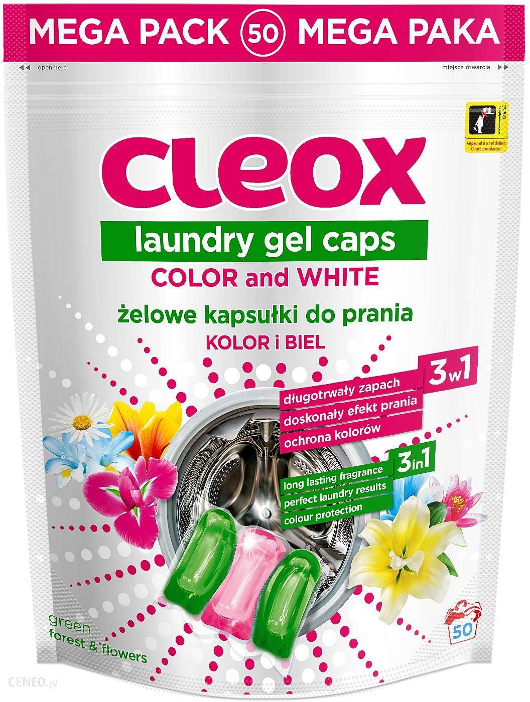 CLEOX – Żelowe kapsułki do prania 50 x 21g Do koloru i do białegoTrzykomorowe żelowe kapsułki do prania – uniwersalne – produkt zawiera aktywne składniki odpowiedzialne za poszczególne etapy prania: usuwanie zabrudzeń, utrzymanie naturalnej bieli i ochrona koloru. Kapsułki zapewnią Twoim tkaninom zapach świeżej zieleni z nutami kwiatowymi i owocowymi.PRZYGOTOWANIE I ZASTOSOWANIE:Włóż kapsułkę do pustego bębna, następnie umieść posegregowane tkaniny. Ustaw odpowiedni program. Zawsze stosuj się do zaleceń producenta odzieży. Nie dotykaj kapsułki mokrymi rękami. Nie używać produktu do prania wstępnego i prania ręcznego. Nie stosować do wełny i jedwabiu.Uwaga. Działa drażniąco na oczy. Działa drażniąco na skórę. Chronić przed dziećmi. W PRZYPADKU POŁKNIĘCIA: wypłukać usta. NIE wywoływać wymiotów. Natychmiast skontaktować się z OŚRODKIEM ZATRUĆ/lekarzem. W PRZYPADKU KONTAKTU ZE SKÓRĄ: Umyć dużą ilością wody. W PRZYPADKU DOSTANIA SIĘ DO OCZU: Ostrożnie płukać wodą przez kilka minut. Wyjąć soczewki kontaktowe, jeżeli są i można je łatwo usunąć. Nadal płukać. W przypadku utrzymywania się działania drażniącego na oczy: Zasięgnąć porady/zgłosić się pod opiekę lekarza. W razie konieczności zasięgnięcia porady lekarza należy pokazać pojemnik lub etykietę. Zawiera 1-(1,2,3,4,5,6,7,8-oktahydro-2,3,8,8-tetrametylo-2-naftylo)etan-1-on, 3,7-dimetyloctan-3-ol, Cytronelol, Salicylan heksylu. Może powodować wystąpienie reakcji alergicznej.