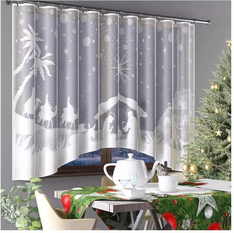 Żakardowa firana upiększona klasycznym wzorem na Święta Bożego Narodzenia, na dole wykończona dekoracyjnym łukiem.Elegancka firanka z modnego żakardu w klasycznym białym kolorze.Ta gotowa biała firanka ozdobiona Bożonarodzeniową Szopką zapewni świąteczny nastrój w każdym domu.
