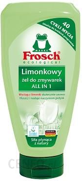FROSCH PROFESJONALISTA W UTRZYMANIU CZYSTOŚCI W TWOIM DOMU Frosch to uniwersalne środki czystości na bazie naturalnych składników. Od 25 lat produkty tej marki są sprzedawane na terenie całej Europy i zyskały zaufanie klientów, gdyż są wydajne, efektywne, chronią skórę dłoni i pozostawiają świeży zapach czystości. To marka naturalna, wygodna w użyciu, o przemyślanej kompozycji i sympatycznym wizerunku. Wszystkie nasze produkty ulegają w wysokim stopniu biodegradacji. Frosch to gwarancja skutecznego czyszczenia w zgodzie z naturą.FROSCH żel do mycia naczyń w zmywarkach 650ml( formuła all in one – wszystko w jednym )Wyciąg z limonki skutecznie usuwa tłuszcz i nadaje naczyniom połysk.Uniwersalny żel do wszystkich typów zmywarek. Żel nie posiada szkodliwych substancji chemicznych takich jak : fosforany,borany,formaldehyd,EDTA,związki halogenoorganiczne.Główną zaletą stosowania żelu jest to, idealnie nadaje się do zmywania w krótkich cyklach.Przy niskich temperaturach zmywania i krótkich programach tabletki potrafią się nie rozpuścić całkowicie, przez co nie działają efektywnie. Żel jest pozbawiony tych wad.Rozpuszcza się natychmiast i działa od razu.WŁAŚCIWOŚCI naczynia pozostają lśniąco czysteformuła z ekstraktami z limonki, znanej ze swoich właściwości czyszczących, skutecznie usuwa tłuszcz i uporczywe zabrudzenia pozostawiając przyjemny świeży zapachformuła Wszystko w jednym ALL-IN-ONE : PŁUKANIE :brylantowy blask naczyń i szkła bez wodnych zacieków. Rola soli : unikanie osadzania kamienia. Ochrona szkła : przeciwdziała zaciemnieniu i nadaje długotrwały połysk. Blask stali nerdzewnej : błysk stali nierdzewnej bez polerowania. Zużycie małej ilości energii : brylantowy błysk naczyń już w 45 stopniach C ZASTOSOWANIEOpakowanie 650 ml starcza średnio na 26 cyki praniaRada :Żel zapewnia dobre wyniki już przy niskich temperaturach zmywania (