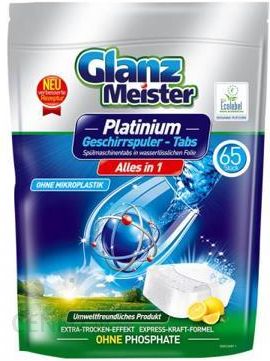 Tabletki do zmywarki Glanz Meister Platinium Alles in 1 – 65szt Marka Glanz Meister to przedstawiciel chemii niemieckiej, specjalizujący się w produkcji środków do czyszczenia kuchni, takich jak tabletki i kapsułki do zmywarkiNowa ekologiczna linia tabletek GlanzMeister PLATINiUM to odpowiedź na potrzeby Waszych Klientów.Wysoce aktywne składniki, samorozpuszczalna folia oraz certyfikat Ecolabel potwierdzający spełnienie wyśrubowanych norm ekologicznych to dziś najbardziej pożądane cechy wśród produktów do zmywarek. Tabletki do zmywarki Glanz Meister Platinium Alles in 1 to skuteczny produkt, który zwalcza nawet uciążliwe zabrudzenia oraz pozostawia naczynia idealnie czyste. Glanz Meister Platinum Alles in 1 skutecznie radzi sobie nawet z takimi zanieczyszczeniami jak stare plamy z tłuszczu czy przypalone resztki jedzenia. Produkt ten zapewnia najwyższą jakość zmywania, dzięki czemu Twoje naczynia będą czyste jak nigdy wcześniej. Naczynia po użyciu tabletek do zmywarki Glanz Meister będą błyszczące, ponieważ produkt ten nie przyczynia się do matowienia szkła. Dodatkowo tabletki do zmywarki Glanz Meister posiadają w swoim składzie substancje, które zapobiegają osadzaniu się kamienia, co przyczynia się do wydłużenia żywotności zmywarki oraz sprawia, że komfort korzystania z niej jest dużo większy.Środek ten zawiera także substancje zmiękczające wodę.Tabletki do zmywarki Glanz Meister są pozbawione fosforanów, które mają negatywny wpływ na środowisko. Sprawia to, że detergent jest bezpieczny oraz przyjazny naturze. Środek zapewnia przyjemny, cytrynowy zapach. Tabletki do zmywarki GlanzMeister Platinium zawierają wysoce aktywne składniki, które szybko i dokładnie usuwają nawet najbardziej uporczywe zabrudzenia.