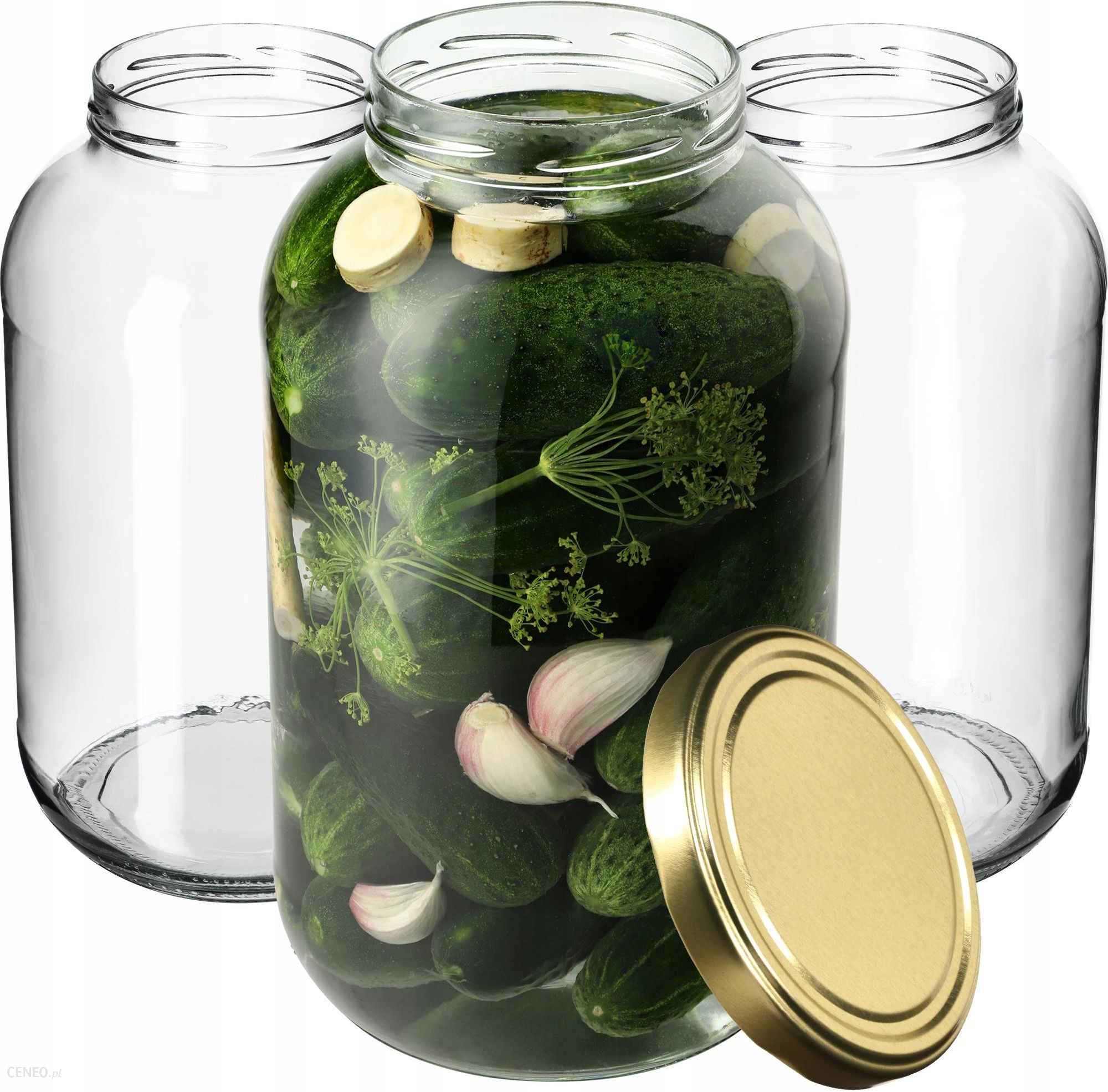 Słój słoik szklany na przetwory ogórki nalewki miód sok 12 szt + zakrętkiSzukasz dużych słoików na domowe przetwory? Szklane słoje o pojemności 4L to idealne rozwiązanie na przygotowanie dużej ilości weków dla rodziny i bliskich. Doskonale nadają się do przyrządzania przetworów z większych warzyw i owoców, a także mięsnych specjałów.Ze względu na dużą pojemnośći szeroki otwór bez problemu pomieszczą ogórki, kapustę, papryki, pomidory, soki, nalewki i dżemy. Co więcej, są łatwe w czyszczeniu, ponieważ można myć je w zmywarce. Sprawdź, dlaczego warto po nie sięgnąć!Praktyczne szklane słoiki do przetworów✅UNIWERSALNE – duże słoiki o pojemności 4000ml sprawdzą się na domowe przetwory z warzyw czy owoców. Nadadzą się do wyparzania, pasteryzacji i przechowywania żywności. Nie pochłaniają zapachów, dlatego można je wielokrotnie wykorzystywać.✅WYTRZYMAŁE – słoje 4L są wykonane z grubego szkła i dodatkowo wzmocnione żłobieniami. Dzięki temu są odporne na delikatne uszkodzenia mechaniczne i wysokie temperatury. Nie pękają podczas wyparzania i wekowania.✅SZCZELNE – szklane słoiki posiadają zamknięcie typu twist o średnicy 100mm, czyli wygodne zakrętki, które zabezpieczają zawartość przed dostępem powietrza, wilgoci i zabrudzeniami.✅POJEMNE – duże słoiki z zakrętkami pozwalają na przechowywanie sporej ilości przetworów. Sprawdzą się do kiszenia ogórków i kapustylub marynowania papryk i pomidorów. Posłużą także jako słoje do nalewek, soków, dżemów i innych przetworów.✔️SPECYFIKACJA:Słoiki na przetwory + zakrętkiMateriał: szkłoKolor: przezroczysty, złotyPojemność: 4130 mlWymiary: 15 x 27,5 cmLiczba sztuk: 12Średnica gwintu: fi 100 mmLiczba zaczepów: 6Waga pojedynczego słoika: 1160 gDuże słoje do kiszenia ogórków i na nalewki✅BEZPIECZNE DLA ŻYWNOŚCI – nasze duże słoiki są przystosowane do kontaktu z żywnością i bezpieczne dla zdrowia. Dodatkowo są łatwe w utrzymaniu czystości i można myć je w zmywarce.✅ESTETYCZNE – nasze słoiki mają tradycyjny wygląd. Ich przezroczyste szkło ułatwia sprawdzenie zawartości bez potrzeby wcześniejszego otwierania. Dzięki temu słoje są praktycznym sposobem przechowywania żywności w kuchni lub spiżarni.✅RÓŻNORODNE – słoiki o pojemności 4 L dostępne są w kilku pakietach: 1, 2, 4, 8 i 12 sztuk. W naszej ofercie znajdziesz również słoiki z dedykowanymi jednokolorowymi zakrętkami.Sięgnij po szklane słoiki z zakrętkami i ciesz się smakiem ulubionych przetworów!