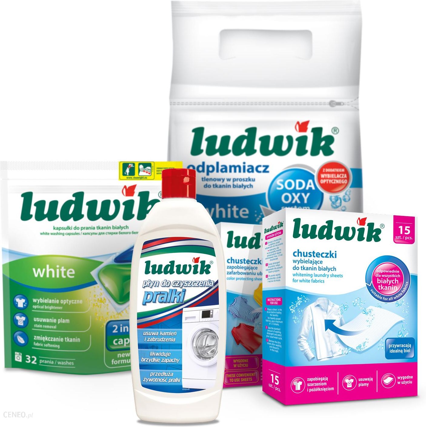 Ludwik ZestawLudwik Do Prania Białego (Kapsułki Do Prania Chusteczki Wybielające Odplamiacz W Proszku Chusteczki Zapobiegające Zafarbowaniu) + Płyn Do