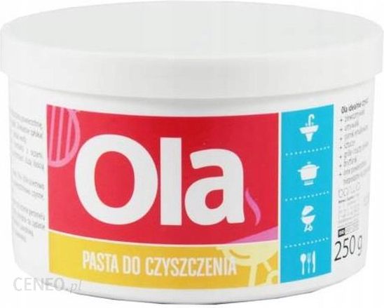 Niezastąpiona w każdym domu pasta OLA usuwa silne zabrudzenia z naczyń kuchennych i urządzeń sanitarnych. Tradycyjna pasta jest niezwykle skuteczna w użyciu, błyskawicznie usuwa tłuszcz i rdzę. Specjalnie wyselekcjonowane ścierniwa i substancje myjące połączone z delikatnym miętowym zapachem pozostawiają czyszczone powierzchnie czyste i świeże. Pasta jest niezwykle wydajna i ekonomiczna w użyciu. Dostępna w wygodnych i poręcznych opakowaniach.