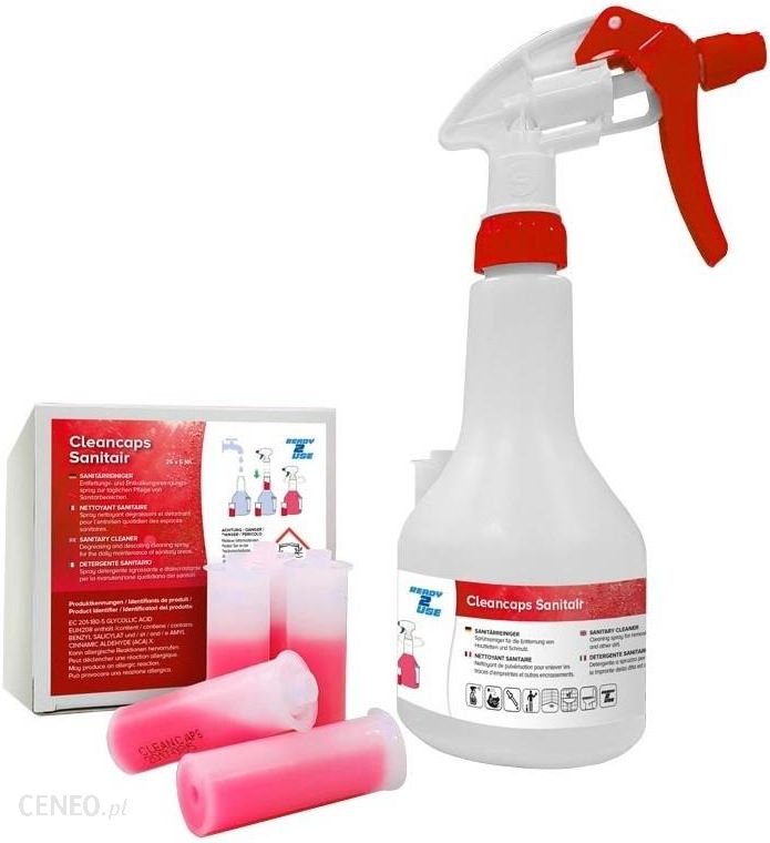 Holenderska firma Tevan jest marką z 40 letnią tradycją w produkcji profesjonalnych środków czyszczących do każdego wnętrza.Gwarantujemy najwyższą jakość i pełną satysfakcję z użytkowania naszych produktów.Tevan Cleancaps Sanitarny to lekko kwaśny środek czyszczący o właściwościach odkamieniających iodtłuszczających.Cleancaps pozwala szybko i skutecznie usunąć lekkie osady wapienne, tłuszczowe i inne zabrudzenia.Dzięki jego właściwościom zapobiegawczym, będziesz mógł odroczyć okresowe czyszczenie.W skład zestawu wchodzi:Jedna butelka Tevan Cleancaps Sanitair4 x dozownik z płynem Cleancaps SanitairUwaga: zachowaj butelkę do wielokrotnego użyciaPrzygotowanie mieszanki CleancapsNapełnić butelkę 500 ml wody.Umieścić wkład Cleancaps w szyjce butelki.Przełożyć rurkę sprayu przez wkład Cleancaps.Docisnąć nakrętkę ze sprayem aż do usłyszenia “kliknięcia”, a następnie dokręcić.Wstrząsnąć, roztwór jest gotowy do użycia.Zawsze opłucz butelkę przed ponownym użyciem.Czyszczenie za pomocą CleancapsPrzygotować produkt w butelce.Rozpylić produkt na ściereczkę z mikrofibry.Wyczyścić powierzchnię.Atuty:Dobre właściwości odkamieniające.Świeży zapach.Dokładne dozowanie i gotowy do użycia.Może być przechowywany w butelce przez co najmniej 1 miesiąc.Pomaga zaoszczędzić koszty magazynowania i transportu.Całkowicie biodegradowalny.Zawiera :Wartość PH : 2,5Surfaktanty