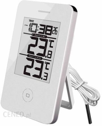 Prosta, mała stacja pogody z pomiarem temperatury zewnętrznej za pośrednictwem czujnika umieszczonego na kablu o długości ok. 1,2m.Posiada podstawowe funkcje: zegar z datownikiem, temperaturę zewnętrzną i wewnętrzną (z funkcją pamięci maksymalnej i minimalnej).Jest dostępna w dwóch kolorach: czarnym i białym.Można ją postawić lub powiesić.Całość zapakowana w estetyczne opakowanie.PARAMETRY TECHNICZNEZakres pomiaru temperatury – wewnętrznej: od 0 do +50°C- zewnętrznej: od –50 do +70°CDokładność pomiaru temperatury +/- 1,2°CZasilanie (baterie nie są dostarczane wraz ze stacją) 2 baterie typu AAA (małe paluszki)Długość przewodu z sondą zewnętrzną ok. 1,2 metraWymiary (szerokość x wysokość x głębokość) ok. 64 x 109 x 23 mmW zestawie stacja pogodyinstrukcja w języku polskimOznaczenia CEGwarancja 2 lata typu door-to-doorDo pobrania instrukcja_obslugi_stacji_meteo_sp_50.pdfKarta katalogowa stacji SP-50 w pliku pdf