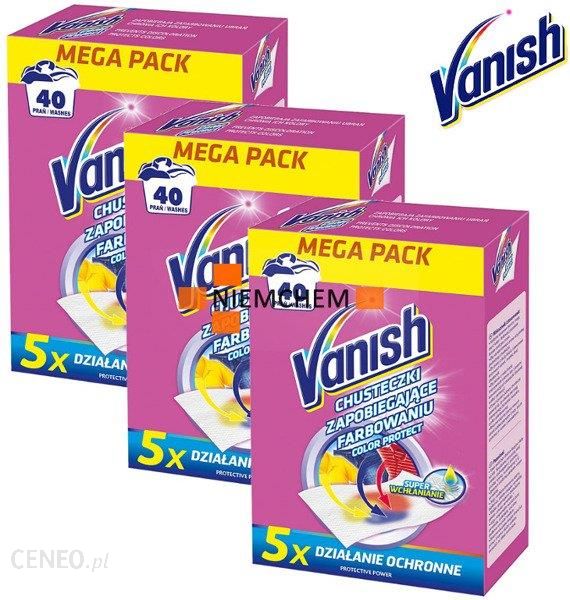 Vanish Chusteczki Wyłapujące Kolory z Prania 3x 40 prańZachowaj intensywne kolory swoich ulubionych ubrań!Dzięki intensywnie absorbującym włóknom mikrofibry chusteczki zapobiegające farbowaniu Vanish Gold Color natychmiastowo przechwytują barwnik wypłukiwany podczas prania, co zapobiega jego przenikaniu na inne ubrania. Skuteczne nawet w przypadku ciemnych ubrań. Niezawodna ochrona już w 30 stopniach Celsjusza. Odpowiednie do każdego cyklu prania, temperatury i pralki.Koniec z uporczywym i dokładnym sortowaniem ubrań!*W porównaniu do Vanish Color Protect Chusteczek zapobiegających zafarbowaniu ubrań.Zalety produktu:• zapobiega farbowaniu ubrań.• supergruba chusteczka chroni kolory ubrań• 50% lepsze wchłanianie dla maksymalnej ochrony*• wnika głęboko we włókna tkaniny• łatwe w zastosowaniu