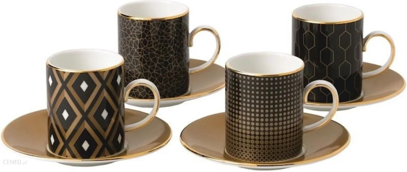 Komplet 4 filiżanek ze spodkami Gio Gold (dawniej Arris) 80ml do espresso marki Wedgwood o interesujących kształtach sprawi, że podana w nich kawa zachwyci nie tylko wybornym smakiem ale również wyjątkową prezencją. Złoty wyrazisty i geometryczny dekor regularnie rozmieszczony na czarno-brązowej powierzchni naczynia czyni je niezwykle oryginalnym. Kolekcja Gio Gold to propozycja niezwykle eleganckiej i wyrafinowanej zastawy stołowej. Charakteryzuje się połączeniem klasycznego stylu przełamanego nowoczesnym geometrycznym dekorem utrzymanym w złotej tonacji i wzbogaconym o wyraziste akcenty utrzymane w kolorystce brązowo-czarnej. Kolekcja obejmuje naczynia użytkowe i dekoracyjne. Jest mocno rozbudowana co daje możliwość stworzenia oryginalnej zastawy herbacianej, kawowej oraz obiadowej dostosowanej do indywidualnych potrzeb użytkownika. Wykonana jest z najwyższej jakości porcelany kostnej charakteryzującej się lekkością, przyjemną mleczno-białą barwą oraz nieskazitelną gładkością. Linia Gio Gold uzupełniona jest o elementy szklane takie jak karafka, szklanki i kieliszki. Wykonane z gładkiego szkła kryształowego wykończonego u podstawy szerokim pasem w kolorze złoto-miedzianym.